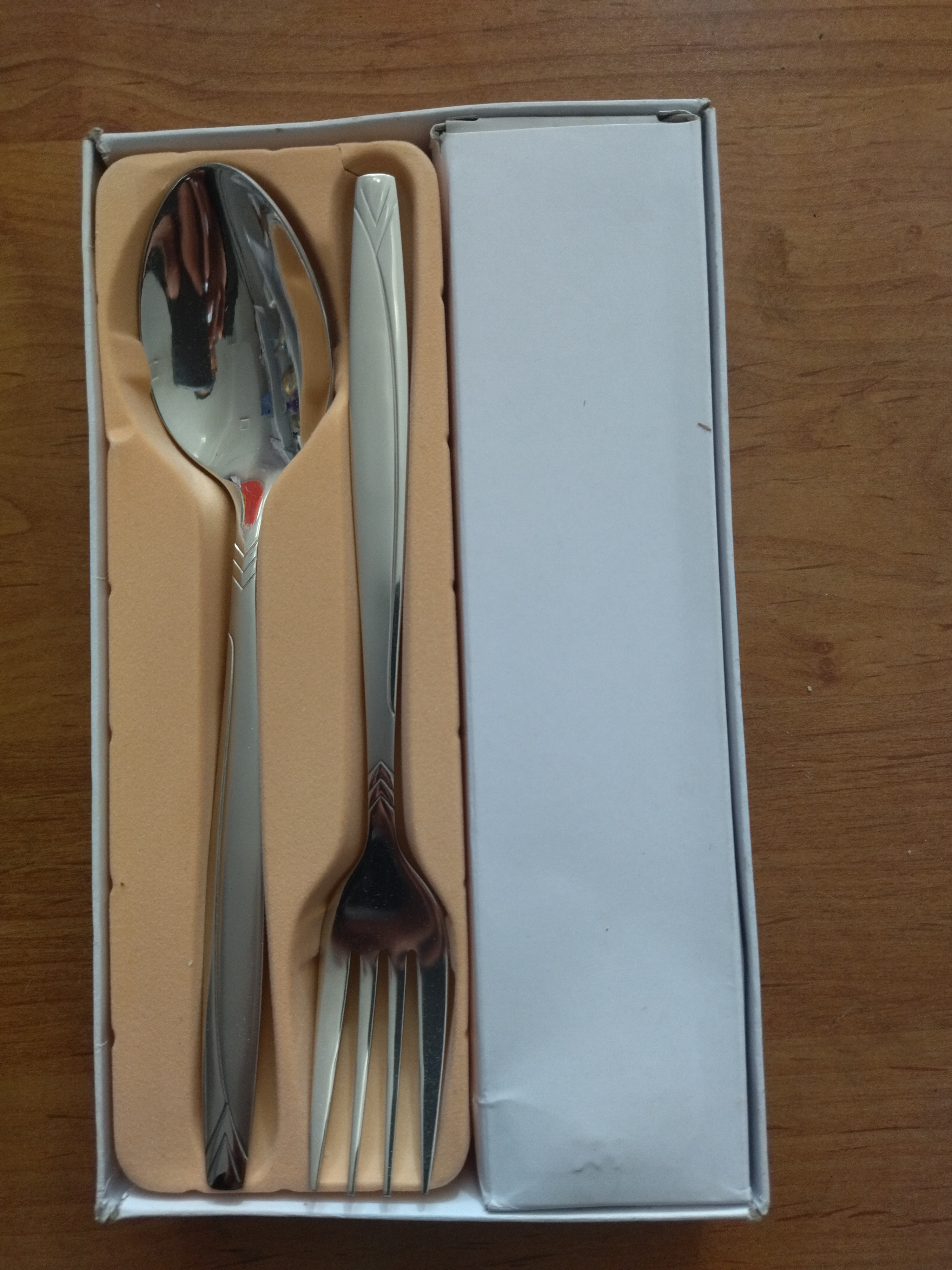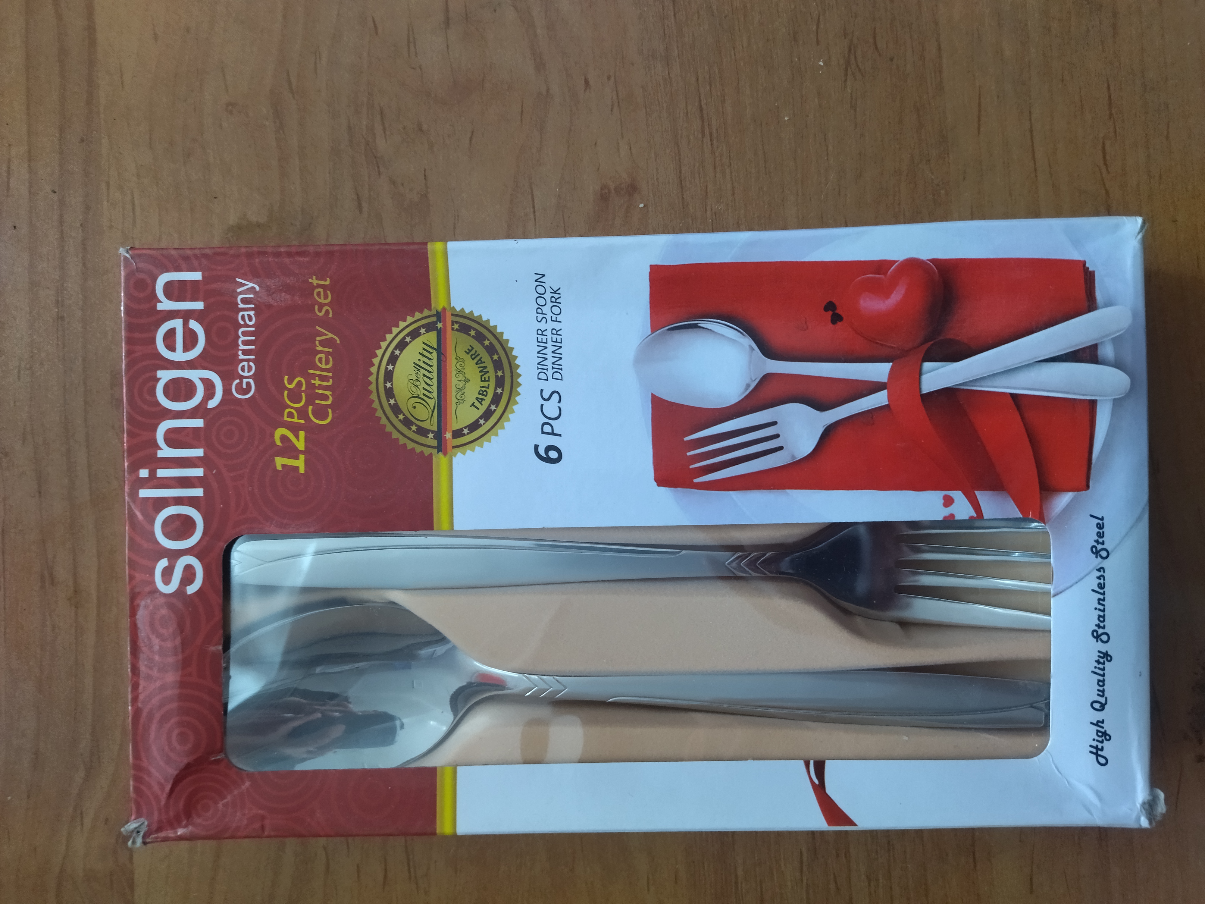 برند : Solingen - تعداد در هر جعبه : ۶عدد قاشق غذاخوری و ۶ عدد چنگال - جنس : استیل s/s18/10 . ضد زنگ وآهن ربا نگیر